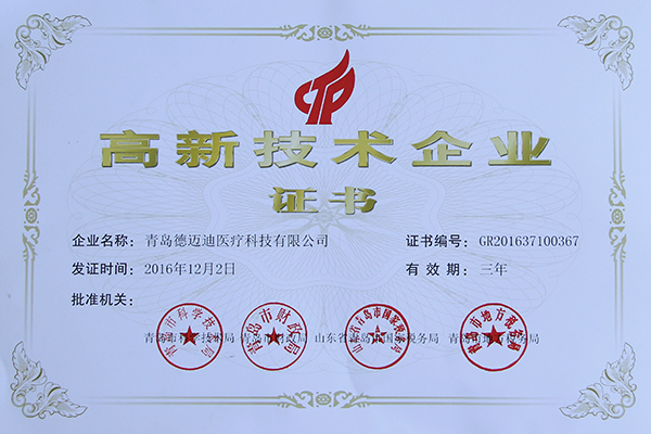 Qingdao DMD Medical Technology Co., Ltd. obtained the high-tech enterprise certificate of Qingdao Science and Technology Bureau & Qingdao Finance Bureau & Shandong Provincial Taxation Bureau & Qingdao Local Taxation Bureau.