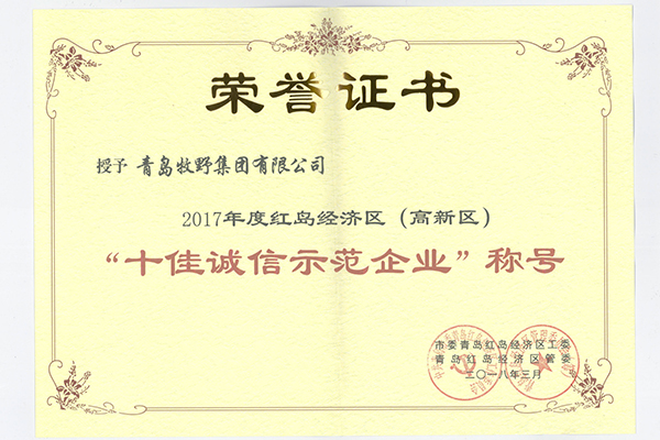 青島牧野集團(tuán)有限公司獲得市委青島紅島經(jīng)濟(jì)區(qū)工委、青島紅島經(jīng)濟(jì)區(qū)管委聯(lián)合授予的2017年度紅島經(jīng)濟(jì)區(qū)(高新區(qū))“十佳誠(chéng)信示范企業(yè)”稱號(hào)